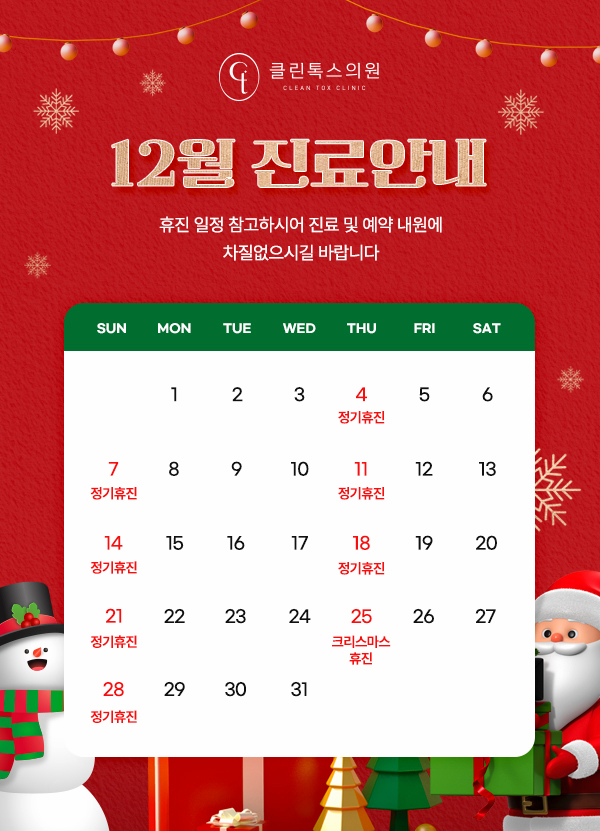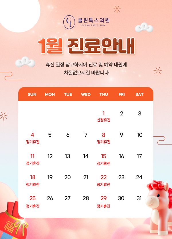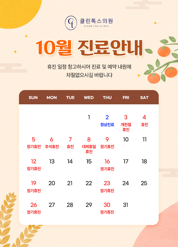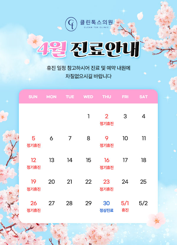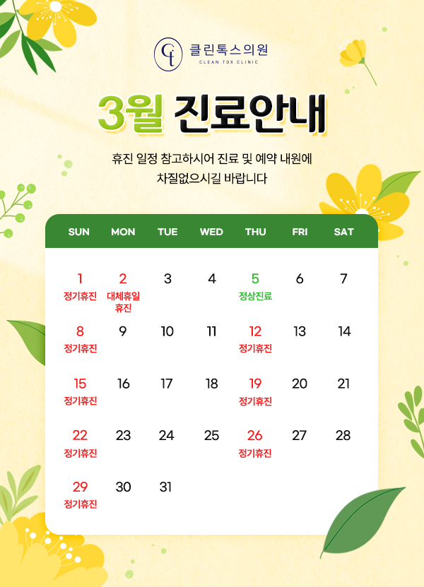 진료시간 안내 월/화/수/금 AM 10:00 - PM 08:00 목요일 휴진 토요일 PM 10:00 - PM 03:00 점심시간 PM 01:00 - PM 02:00 ※ 마감 30분 전까지 접수 가능 / 토요일은 점심시간 없이 진료 ※ 일요일 및 공휴일 휴진