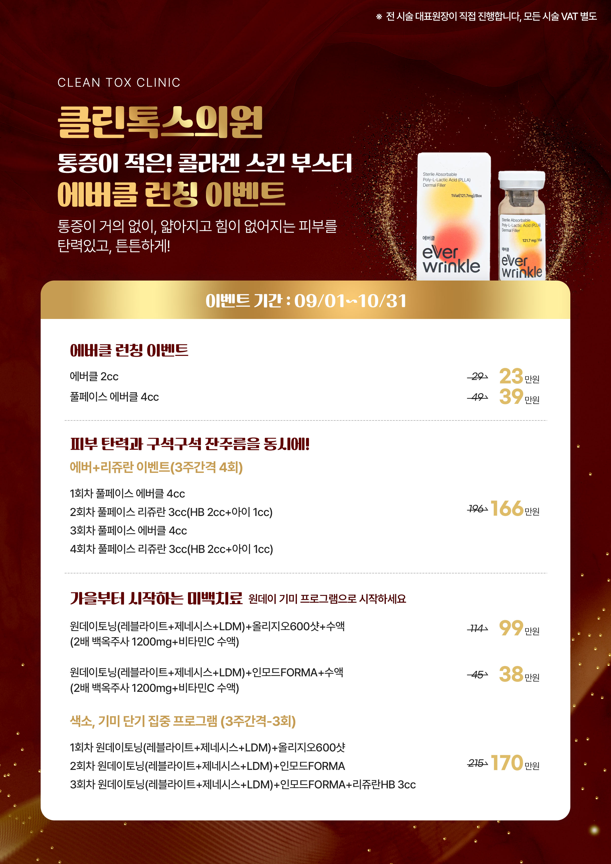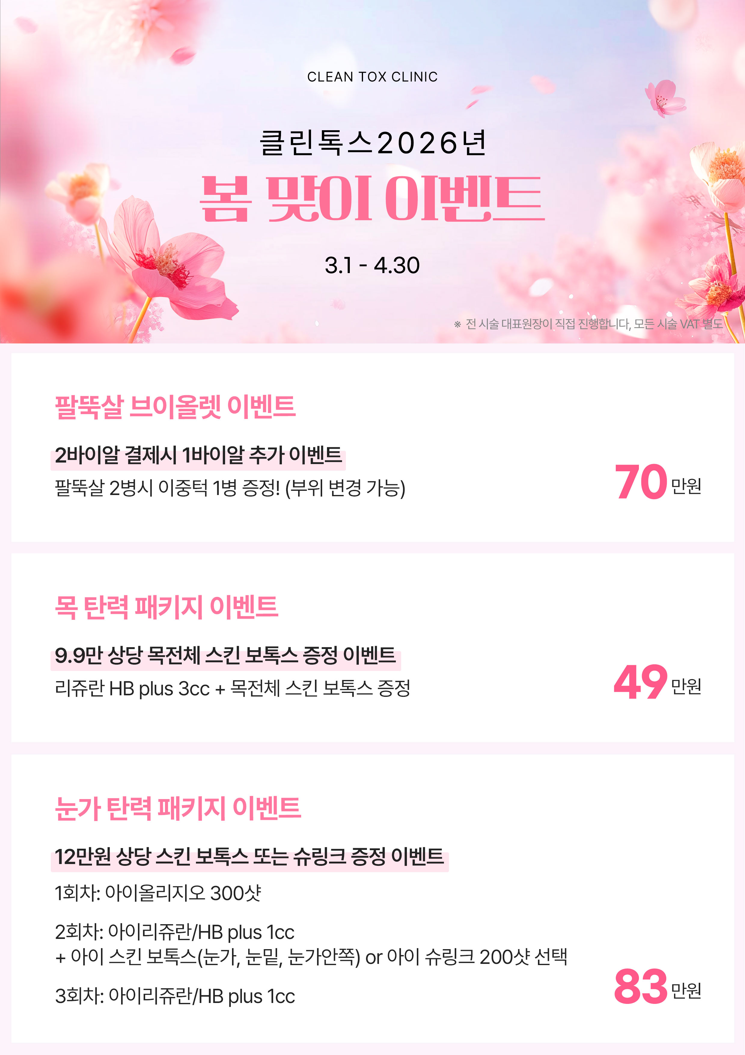 1:1 맞춤 디자인으로 만족도 UP 개인별 맞춤형디자인 필러 VIEW MORE 섬세한 시술로 말끔하게 이마, 미간 등미세 주름 필러/흉터필러 VIEW MORE 탄력과 물광을 동시에 개선 쥬베룩물광 모공탄력주사 VIEW MORE